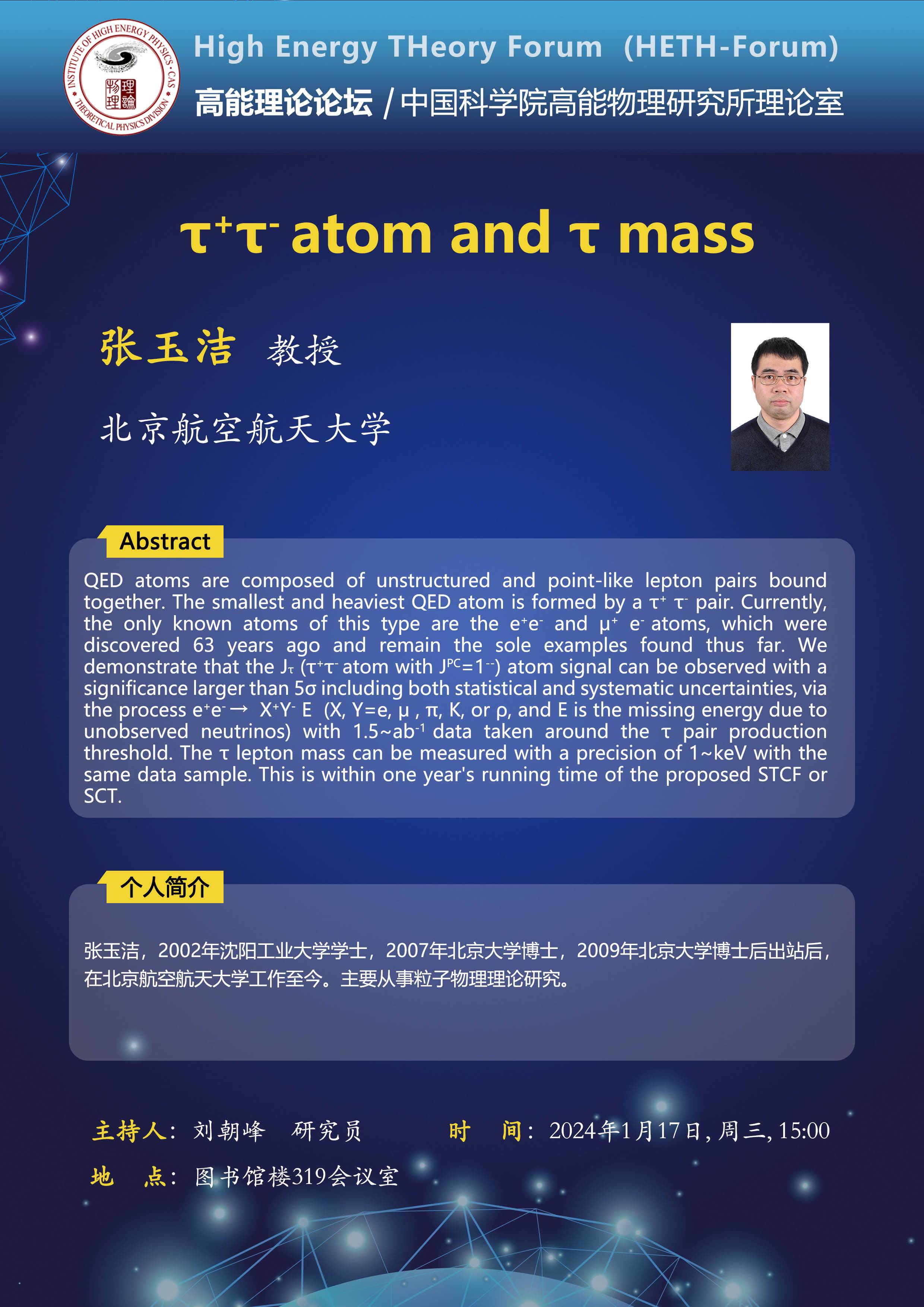 【01.17】高能理论论坛第67期--$\tau^+\tau^-$ atom and $\tau$ mass