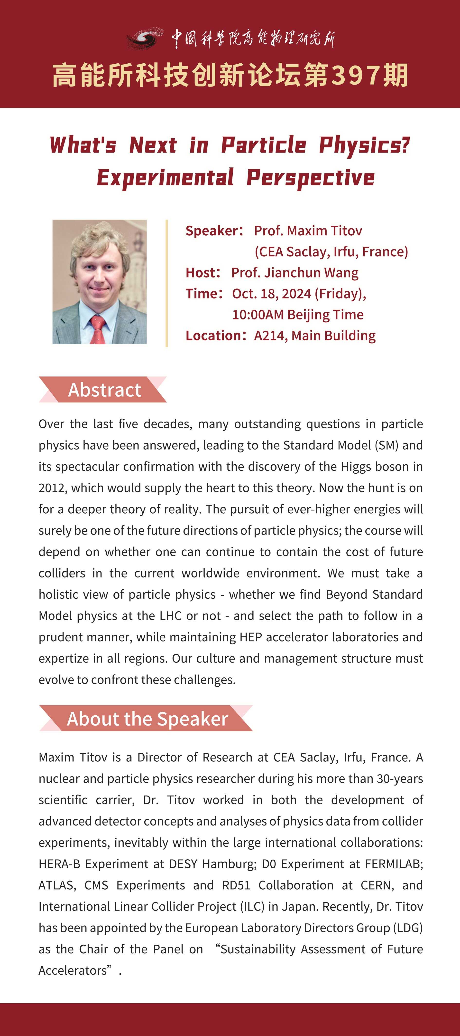 【10.18】高能所科技创新论坛(397)What's Next in Particle Physics? – Experimental Perspective