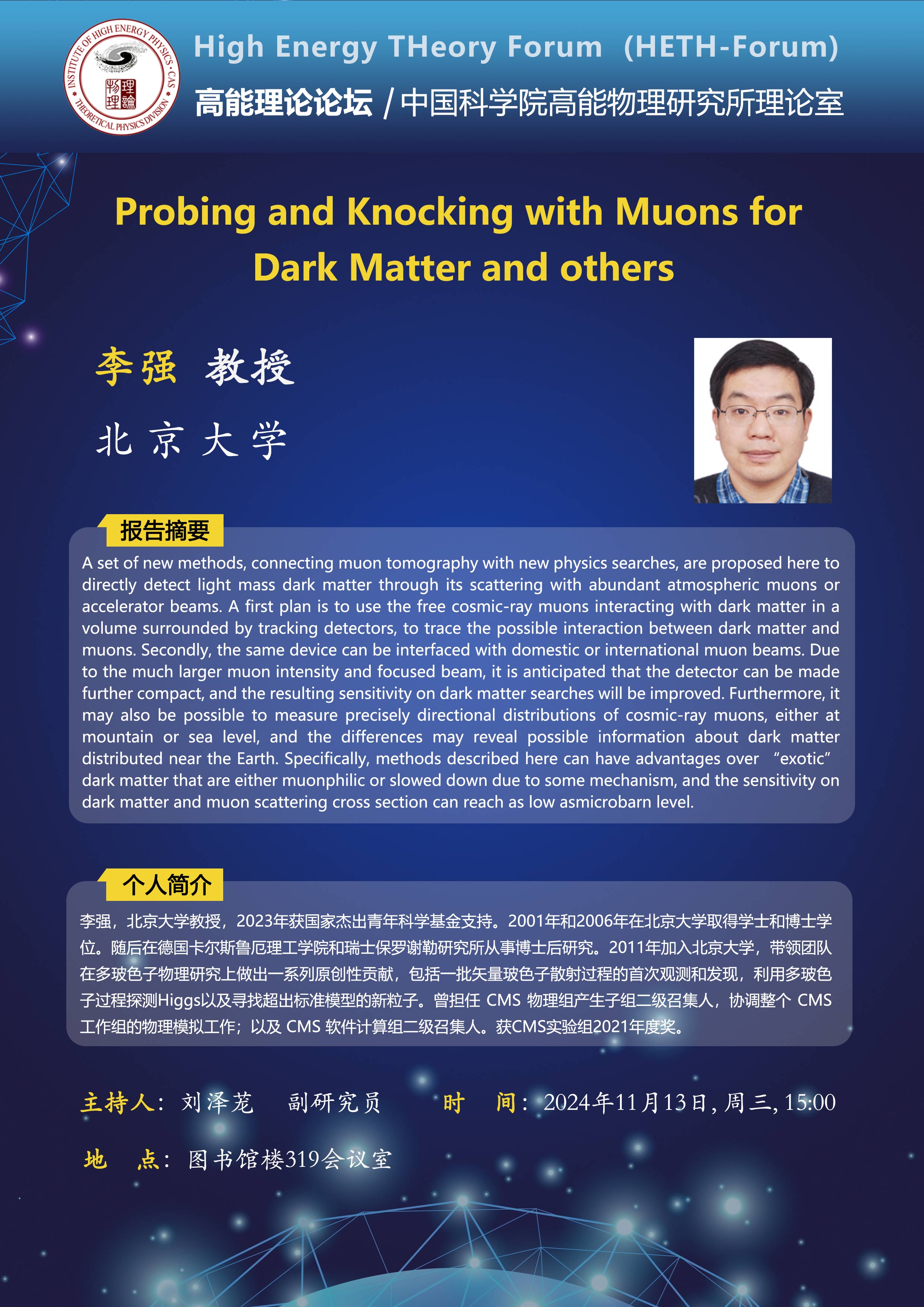 【11.13】高能理论论坛第84期--Probing and Knocking with Muons for Dark Matter and others