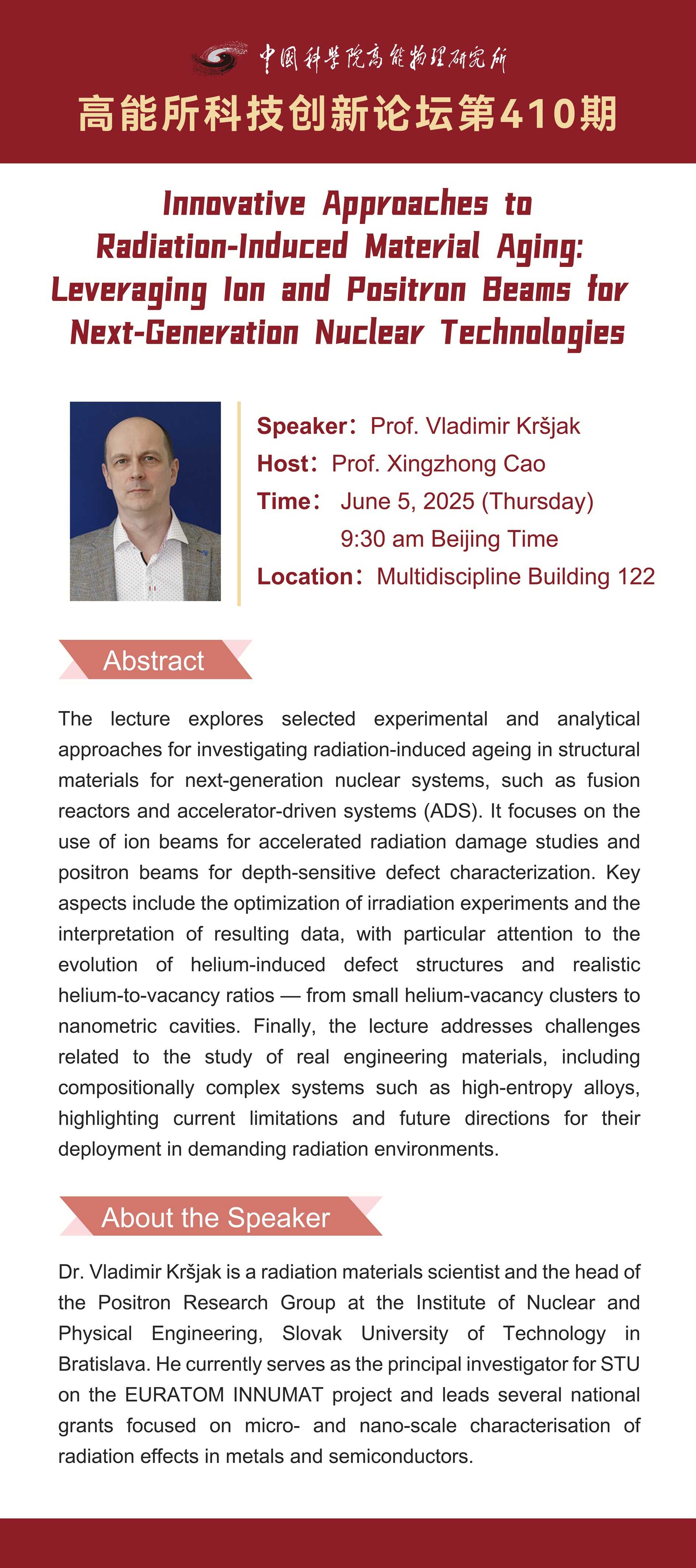 【06.05】高能所科技创新论坛(410)Innovative Approaches to Radiation-Induced Material Aging: Leveraging Ion and Positron Beams for Next-Generation Nuclear Technologies