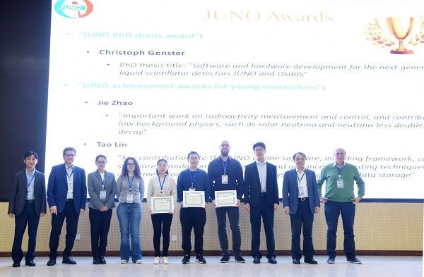 在第13届合作组会上决定设立江门中微子实验“博士论文奖”和“青年科学家奖”,旨在提升优秀青年人才。高能所林韬副研究员和赵洁副研究员分别因在软件和低本底研究中的突出贡献,获得了2019年度“青年科学家奖”。“博士论文奖”则由德国图宾根大学的Christoph Genster获得。合作组会期间举行了颁奖仪式。