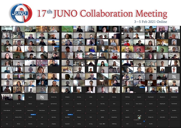 2021年2月3日至5日,江门中微子实验第17届国际合作组大会以网络会议的形式成功召开。来自中国、意大利、德国、法国、俄罗斯、美国、智利、泰国、巴基斯坦、亚美尼亚、中国台湾等国家和地区的220余名研究人员参加了此次会议。考虑不同国家和地区的时差,此次会议均安排在北京时间下午和晚上。在大会之前,已进行了32场技术评审会和各系统分会。