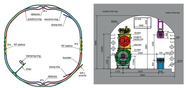 进入地下: CEPC 布局(左)和采用钻爆法的隧道横截面(右),显示外侧为 SppC 环和低温模块(绿色和红色),内侧为 CEPC增强器(紫色)和对撞机环(蓝色)。资料来源:高能所