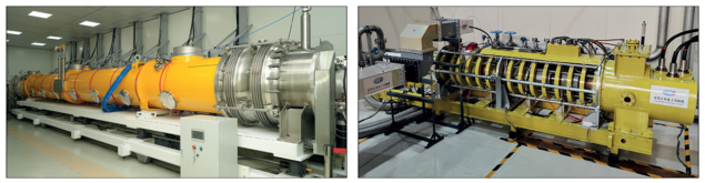 CEPC技术:高能所研制并测试的1.3 GHz 8×9单元腔低温模组(左)和650 MHz 800kW连续波长高效速调管(右)。资料来源:高能所