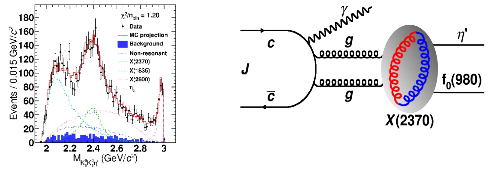 上图为BESIII实验在中在J/ψ→γKS0KS0η' 质量谱上X(2370)粒子和胶球产生示意图量子数测定