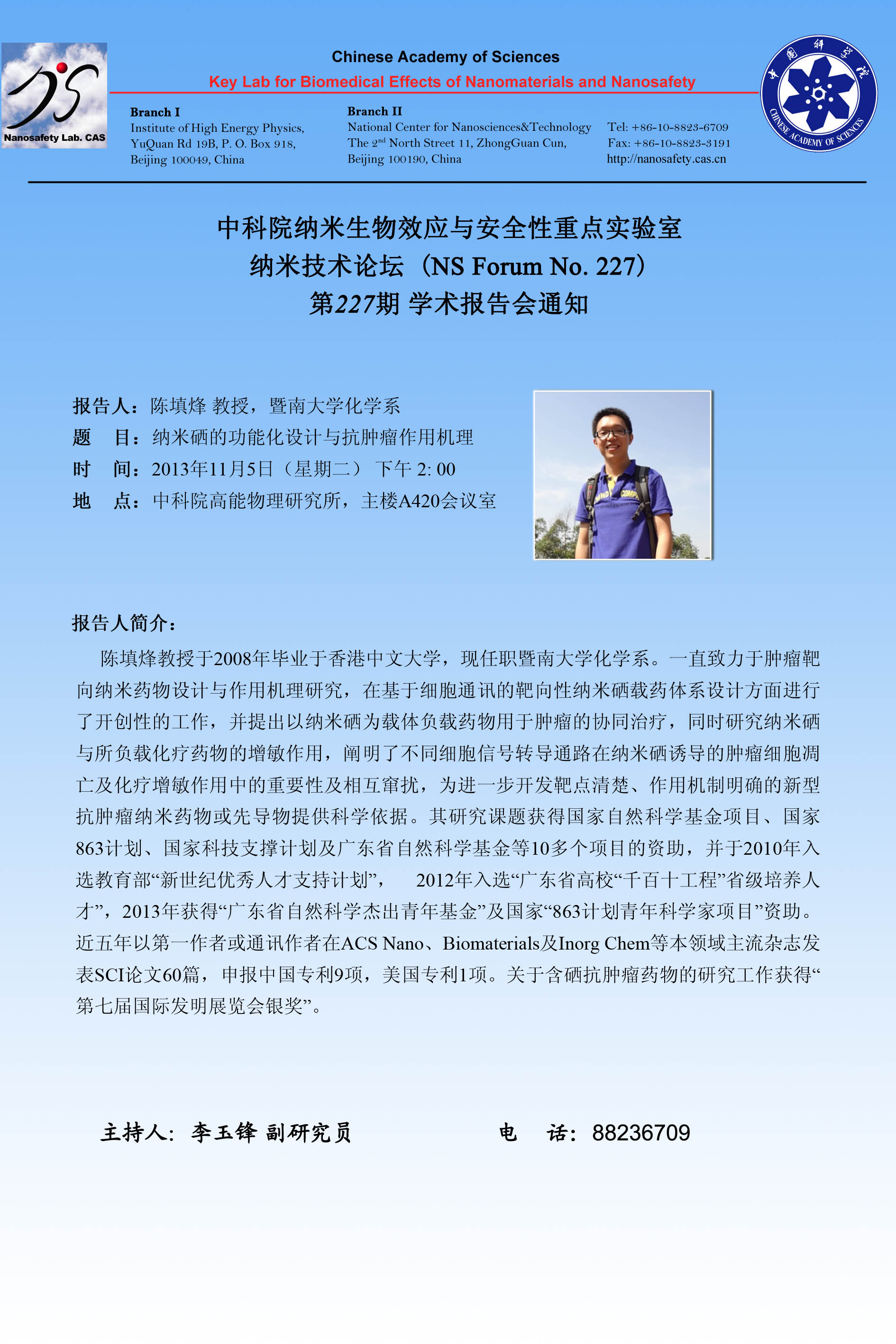 中科院纳米生物效应与安全性重点实验室纳米技术论坛 (NS Forum No. 227)第227期学术报告会通知