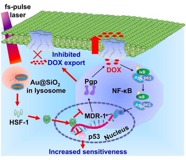 最近,国家纳米科学中心陈春英课题组与吴晓春课题组合作,在逆转肿瘤耐药性方面取得重要进展。利用二氧化硅包覆金纳米棒(Au@SiO2)的可控光热效应逆转了肿瘤细胞的耐药性。发现用低于光热治疗强度的飞秒脉冲激光照射摄入Au@SiO2的耐药细胞产生了独特的光热效应,可诱导细胞内热休克因子(HSF-1)表达、三聚体化、入核、抑制NF-kB通路,既能高效抑制细胞膜上药物输出泵蛋白(P-glycoprotein,Pgp)的表达,增加细胞内化疗药物蓄积;又能成功诱导耐药细胞内突变p53蛋白的降解,对化疗药物增敏,最终有效克服肿瘤耐药(图1)。而传统的水浴热刺激不能克服肿瘤耐药,表明微小空间内局部热刺激的重要性。相关研究结果发表在《先进功能材料》(Adv. Funct. Mater. 2014, DOI: 10.1002/adfm.201400015)。文章被审稿人高度评价,认为应该作为VIP文章加快发表 。