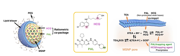 基于周期蛋白依赖性激酶(CDK) 4/6抑制剂的肿瘤联合治疗和协同给药纳米颗粒支持在肿瘤位点的最佳药物协同作用,研究团队提出了用于CDK4/6抑制剂联合治疗方案的纳米共载体,设计了具有最佳协同作用水平的纳米载体负载的选择递送CDK4/6抑制剂 PAL和自噬抑制剂羟氯喹(HCQ)。除了PAL/HCQ组合外,该纳米载药体系可应用于其他自噬抑制剂、化疗药物、MEK抑制剂和免疫调节药物。该团队通过对纳米载体进行迭代优化、配方设计,并考虑纳米载体有限空间中质子化状态和药物的稳定性,在PAL/HCQ组和的基础上配合pan-Bcl-2的抑制剂ABT-737,实现同步PAL/HCQ的药物代谢和瘤内的生物分布,同时大大降低药物毒性,提高抗癌效果。