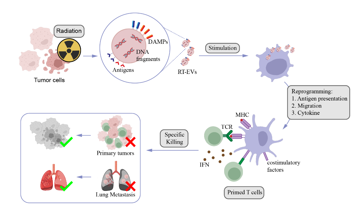 肿瘤疫苗在近几年的发展中取得了巨大的进展,通过引起体内的免疫效应来杀伤肿瘤。辐射肿瘤细胞来源的细胞外囊泡(radiated tumor cells-derived extracellular vesicles, RT-EVs)含有多种肿瘤抗原、核酸等生物活性物质,相较于全肿瘤细胞疫苗(TCVs)其更小的尺寸更利于抗原提呈细胞摄取并加工。基于此,快盈v3的研究团队开发了一种利用硼中子俘获疗法(BNCT)衍生的细胞外囊泡(EVs)来提升树突状细胞(DC)疫苗抗肿瘤效能的新策略。