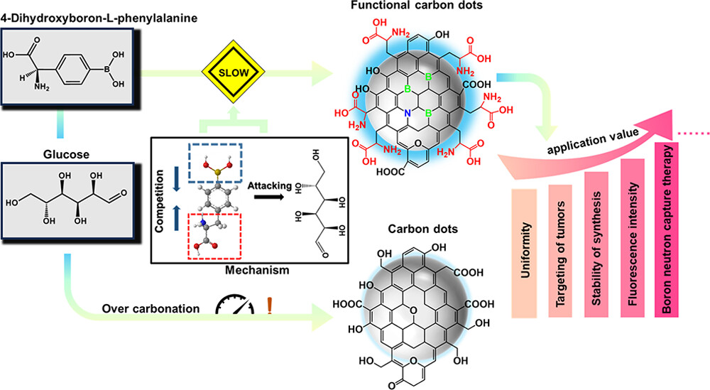 功能化碳点表面的氨基酸残基还可通过肿瘤细胞表面的氨基酸转运体和葡萄糖转运体实现双重靶向摄取。高的硼含量和荧光特性使这种功能性碳点有望成为硼中子俘获治疗(BNCT)的新型硼载体,在生物医学领域展现出巨大应用潜力。研究团队通过分子设计实现功能基团在复杂反应中的精准保留,为碳点材料在肿瘤治疗、生物成像等领域的临床转化提供了新的思路。