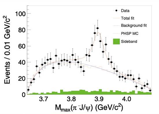 BESIII实验在2013年采集的数据中发现一个新的共振结构,命名为Zc(3900)。它含有一对粲夸克和反粲夸克且带有电荷,提示其中至少含有四个夸克,可能是科学家长期寻找的一种奇特态粒子。