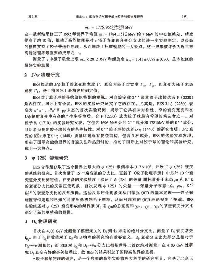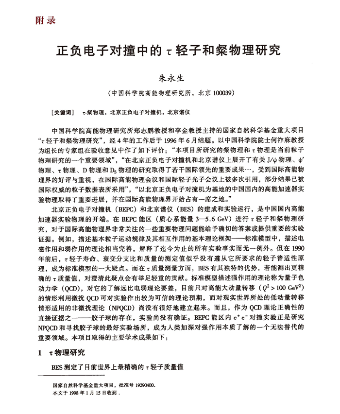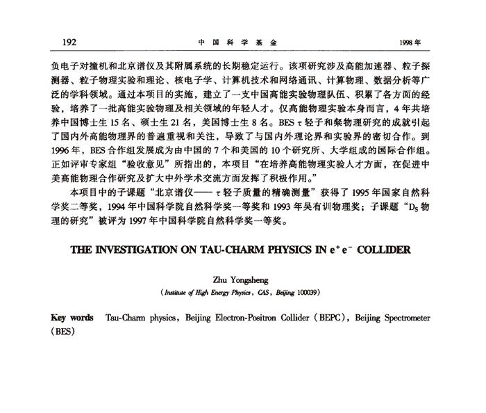 发表在《中国科学基金》1998年第3期的“正负电子对撞中的τ轻子和粲物理研究”一文(见附录)简要报道了到1996年6月为止北京谱仪获得的首批物理成果。其中不少成果处于当时的国际领先水平,被国际权威的物理期刊和粒子数据表刊登,引起了国际高能物理界的重视与好评;特别是以高精度测量了τ轻子的质量值(精度为当时已有测量值的10倍),修正了1992年世界平均值约7MeV的中心值偏差,推动了国际高能物理界对τ轻子寿命和衰变分支比的进一步实验测量,以很高的精度支持了轻子普适性原理,解决了粒子物理标准模型当时存在的一大疑点,这一成果被评价为当时高能物理界最重要的成果之一。
