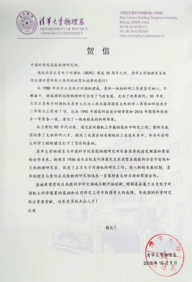 清华大学物理系贺信