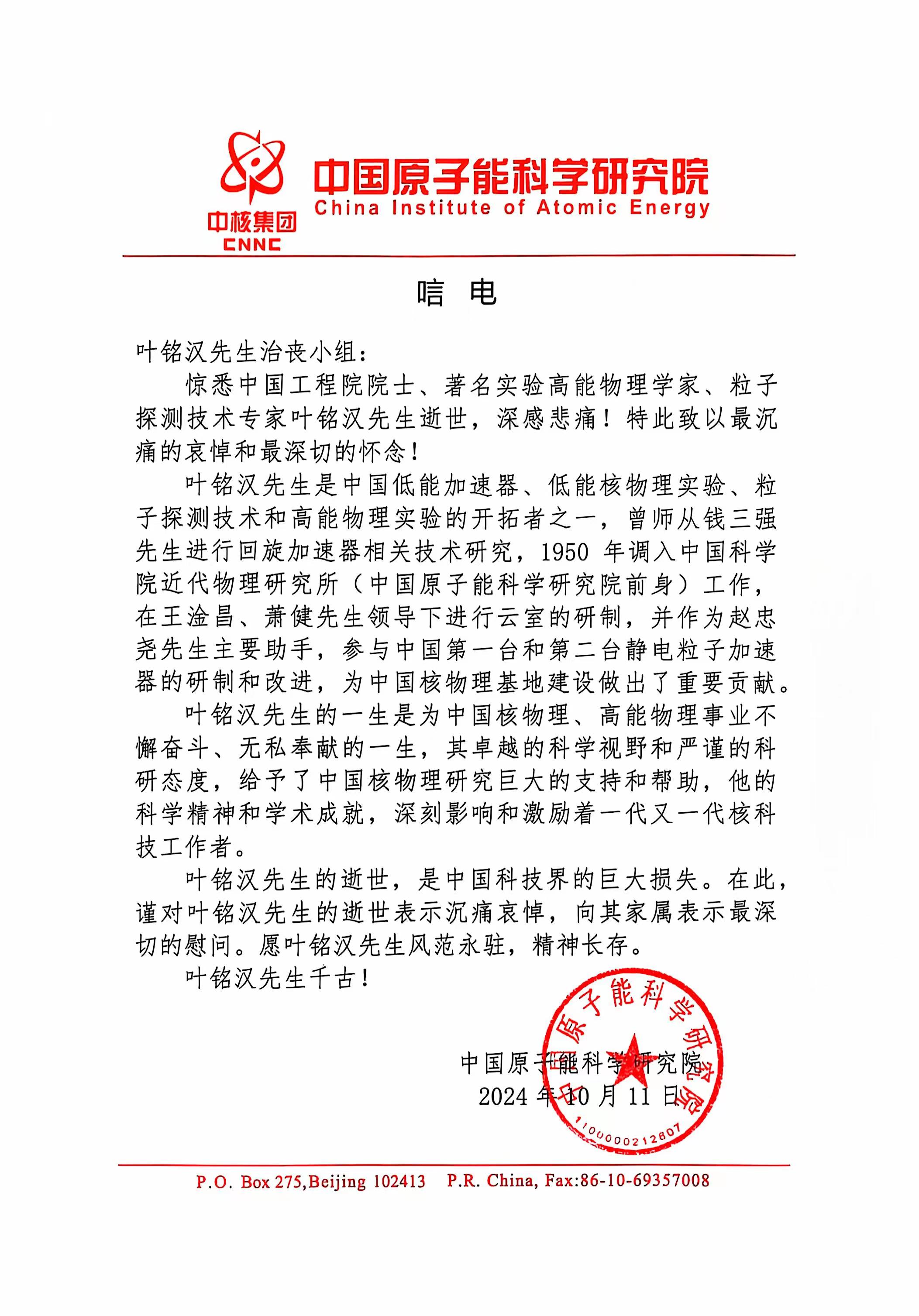· 中国原子能科学研究院唁电 2024.10.14
