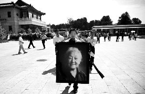 何泽慧院士的孙子钱绍强手捧着奶奶的遗像。昨日,何泽慧院士的遗体告别仪式在八宝山革命公墓东礼堂举行。周岗峰 摄