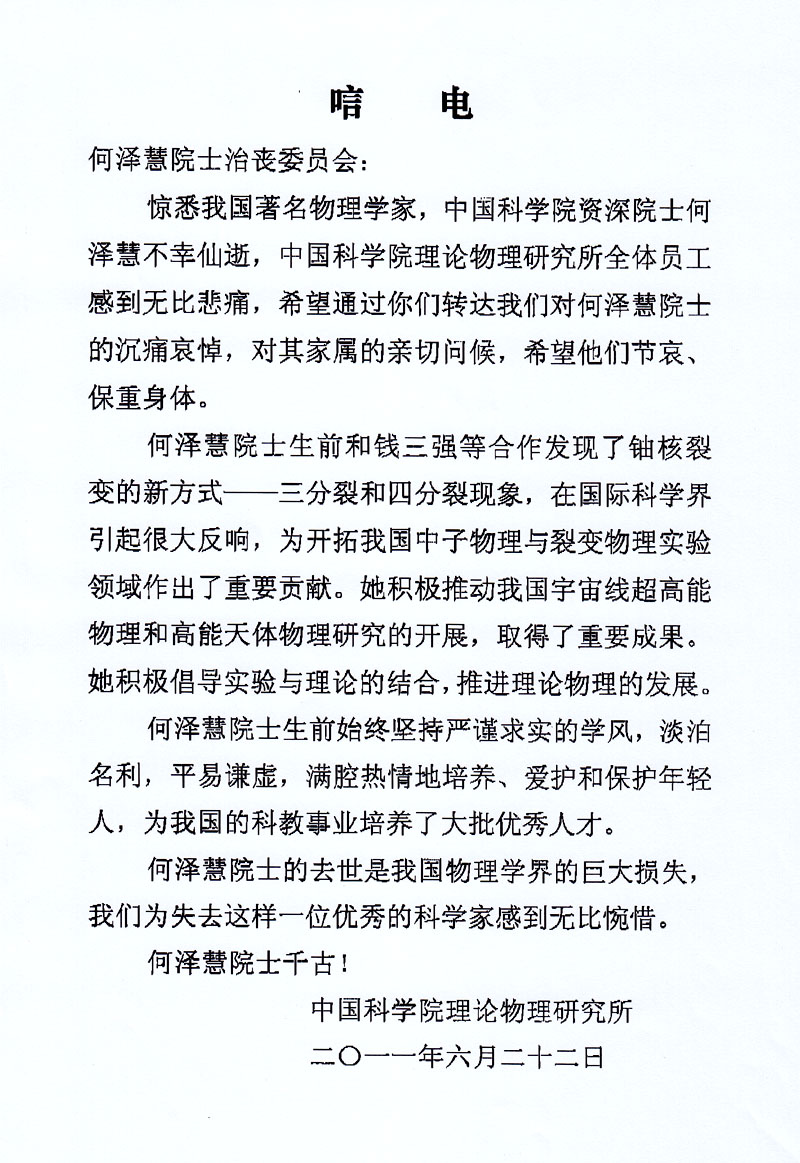 中国科学院理论物理研究所唁电