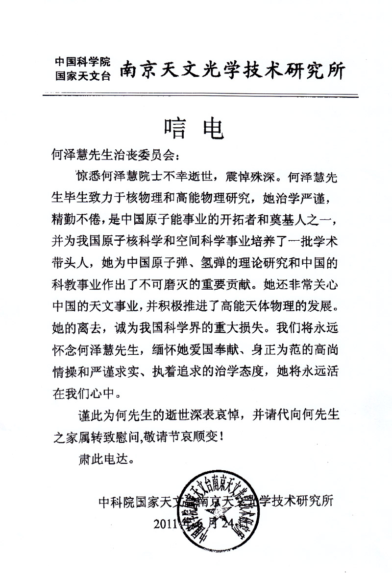 中国科学院国家天文台南京天文光学技术研究所唁电