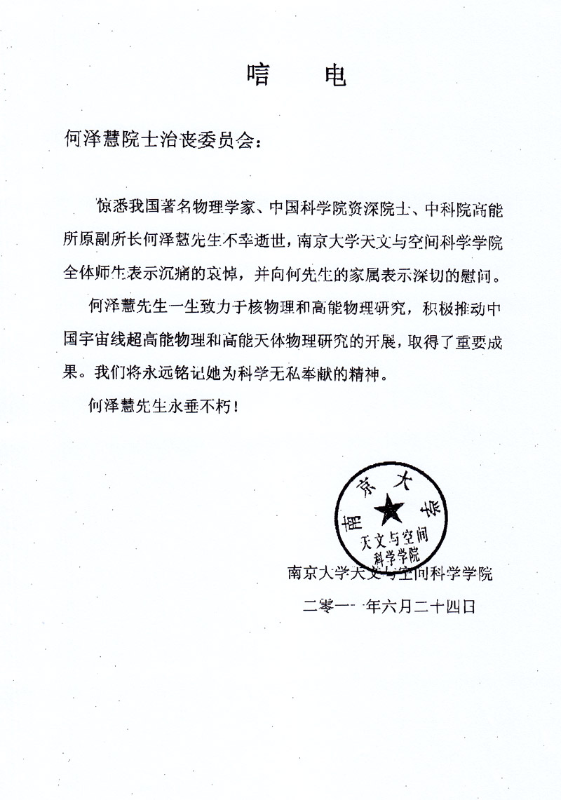 南京大学天文与空间科学学院唁电