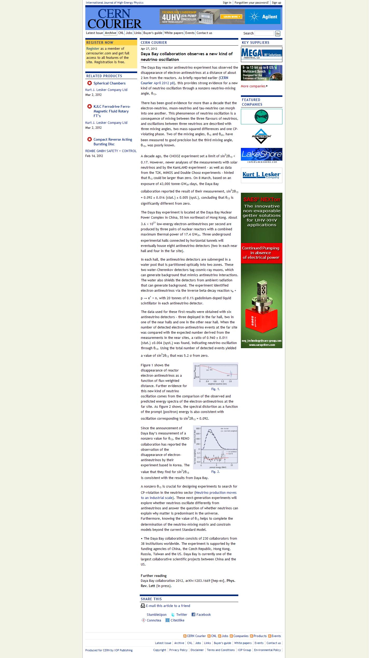 The Daya Bay reactor antineutrino experiment has observed the disappearance of electron-antineutrinos at a distance of about 2 km from the reactors. As briefly reported earlier (CERN Courier April 2012 p8), this provides strong evidence for a new kind of neutrino oscillation through a nonzero neutrino-mixing angle, θ13.